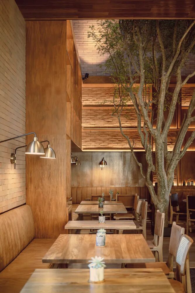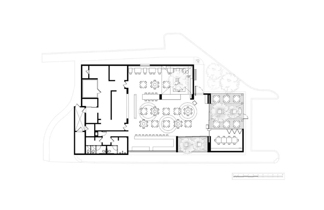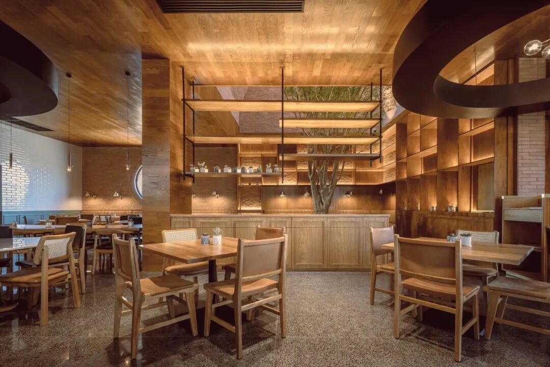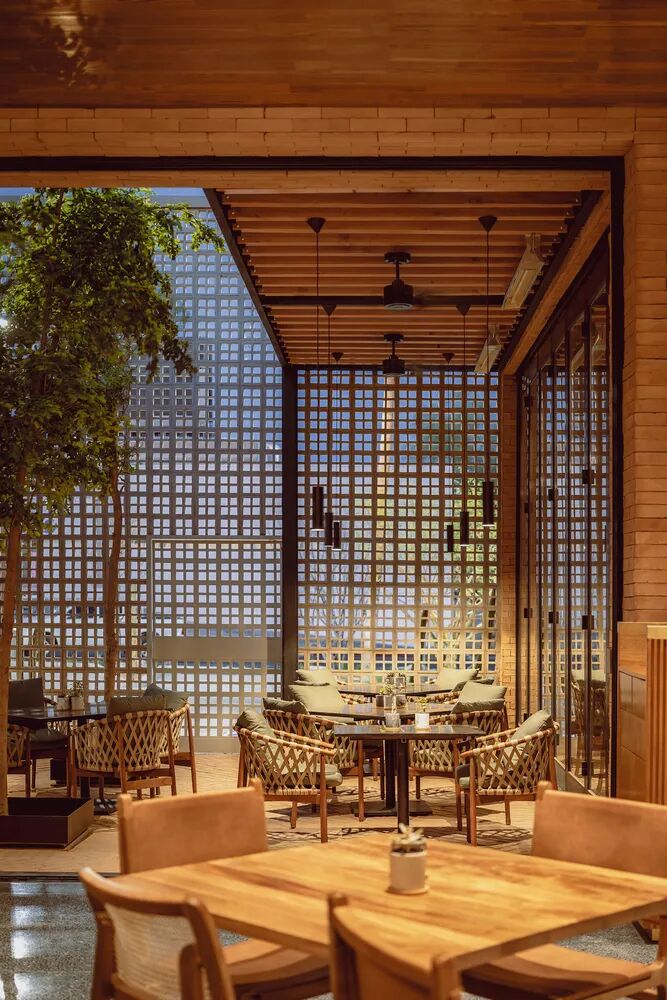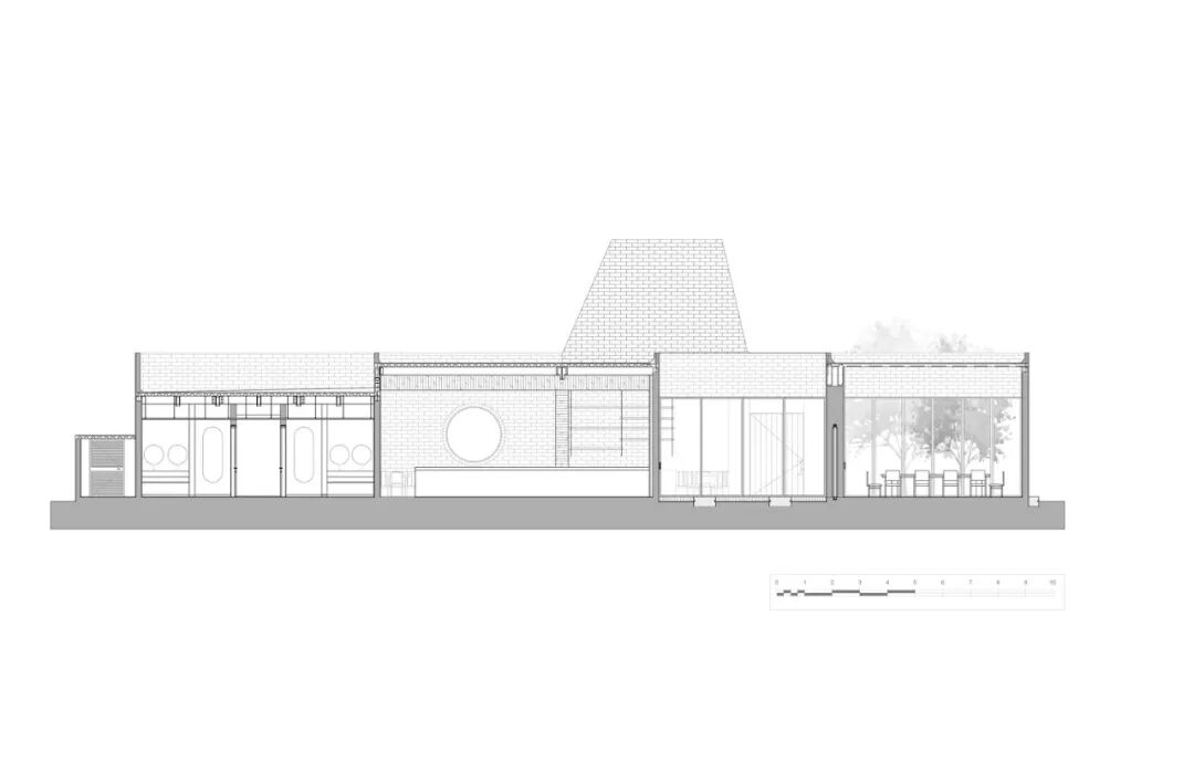 餐厅的所有功能空间位于同一层,横向延展的建筑体块与垂直突出部分呈现自然的对立态。格栅的使用意在给用户提供一个与外部有所联结的可穿透空间的同时,保证主体室内空间的私密性。