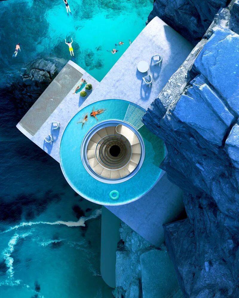 圆形别墅是位于悬崖凹面处的避暑别墅的概念设计。这个项目的关键是设计的房子的形状融入了岩石景观的结构。设计中的白色抽象体积适合悬崖的同时,并且不会和悬崖产生直接的几何联系。设计过程被视作一次实验,旨在寻找一种将房屋功能与观察视点相结合的概念。