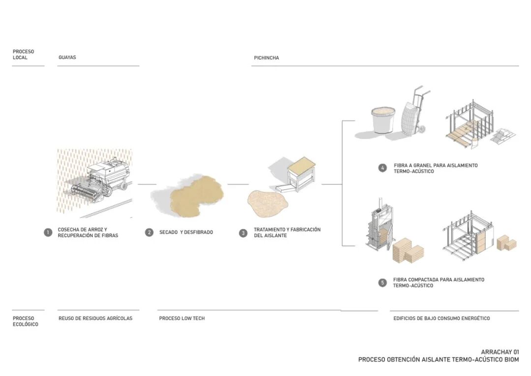 该项目致力于减少碳排放量,其挑战在于在不使用石油基材料,又要创造高效的绝缘材料。这创造了一个新的挑战,建筑师与 YES 创新公司一同研发这项技术。实验从 BIOM 开始,这是一种利用了大米纤维热特性的新型生物源隔热材料。这一想法对厄瓜多尔海岸 Daule 社区产生三重影响(社会、环境和经济),这些纤维过去在那里仅用于焚烧,而现在则可应用于循环经济。在 Arrachay 中,建造的每个部分都被纳入了考虑范围(门、墙和屋顶),并确定了 BIOM 的正确密度 50kg/m³来填充木结构。隔热材料用天然阻燃剂覆盖,并手工包装于结构之中。隔热材料的大量使用可以优化现场的安装,避免热桥。尽管外部环境存在温度变化,但隔热材料的密度和隔热特性有助于保持室内热量,从而使其具有较好的隔热性能。通过红外热成像的现场分析,证实了隔热性能在建筑各处得到了均匀分布。