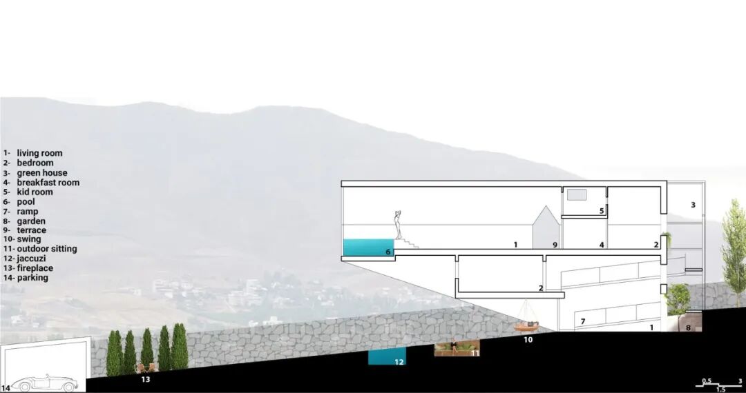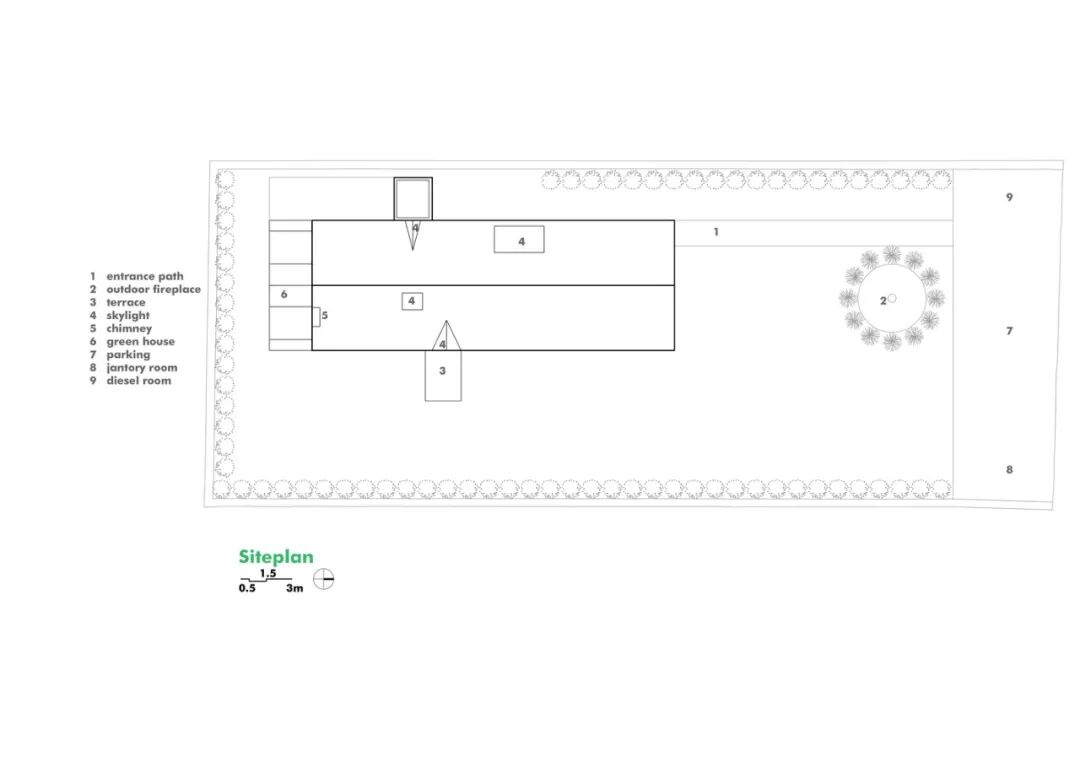 场地长约 50 米、宽约 20 米,因此在设计之初时,建筑师决定将别墅沿场地北侧长边设计,以此让人们更好地欣赏北面的美景。