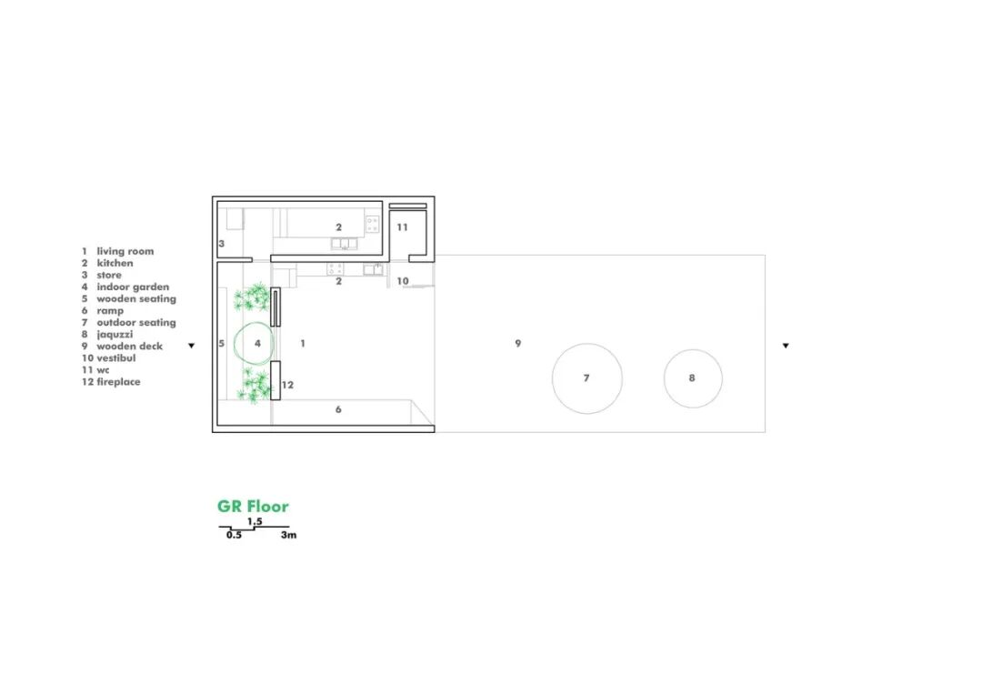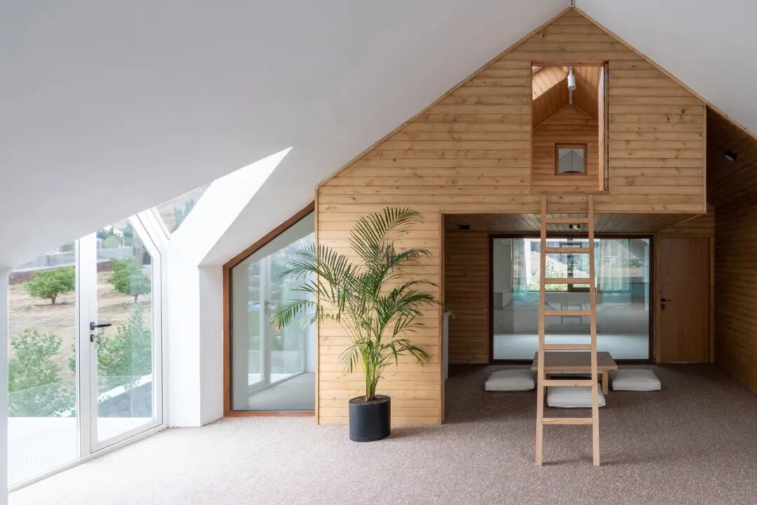 建筑师将最初的基本体块沿立面对角线切割,由此将朝北的视野引入建筑核心区域,同时为其打造了一个面向庭院的户外有屋顶空间,从而让住户在享受院落时可以免受正午直射阳光的酷热,同时还可以亲身体验到雪和雨的酣畅。另外,居住者在寒冷些的季节不会被限制在房屋的界限内,而是可以享受更大范围的院子。