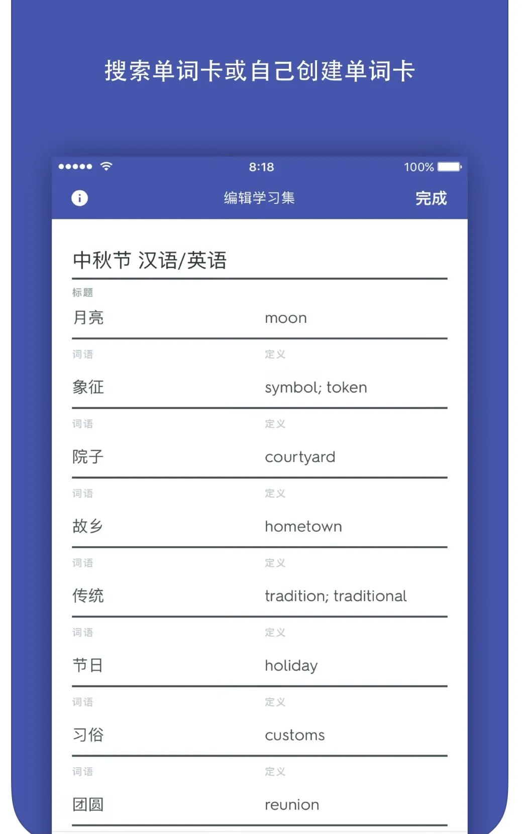 Quizlet不仅可以创建自己的flashcard(单词卡),支持单词、词组类记忆内容,也支持图表型的记忆学习,更有White(书写)、Spell(拼写)、Learn(学习)、Test(测试)等多重功能巩固记忆,辅助学习。平台不仅可以直接使用其他用户共享的学习集,也可以自己录入或导入要学习的内容,实现定制个性化学习。