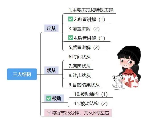 定语从句,状语从句和被动,英一英二都一样一共11节,一节课20-30分钟,一共5小时左右。