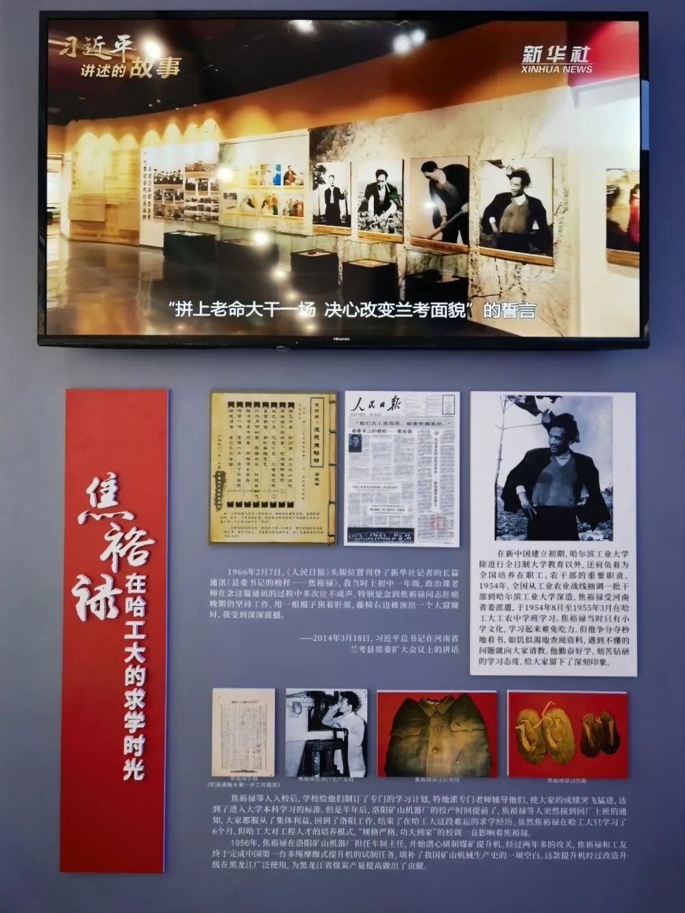 哈工大中心展出的“焦裕禄在哈工大的求学时光”展板和播放的焦裕禄影像资料。(哈尔滨工业大学供图)![]()