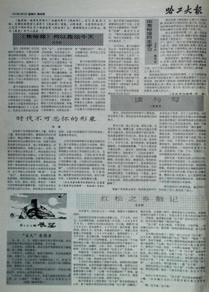 1991年,《哈工大报》展现影片《焦裕禄》报道。(哈尔滨工业大学供图)“焦裕禄在校学习时间虽短,但‘规格严格,功夫到家’的校风学风一直影响着他,激励他为民造福……”在“开学第一课”中,面对“00后”新生,哈尔滨工业大学党委书记熊四皓如是说。榜样的力量铭记在心。2014年夏天,哈工大学生党员组成的暑期基层社会实践团走进兰考,学习践行焦裕禄精神,开展民生调查。他们跋涉近百公里,走遍4个乡镇、6个村,乡镇企业、田间地头、农民家中都留下了他们的足迹,最终形成了5万余字的《兰考民生考察手记》。