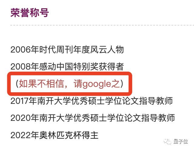 胡教授说,曾经还获得过“2006年时代周刊年度风云人物”和“2008年感动中国特别奖获得者”,他在这条下面特别标注道: