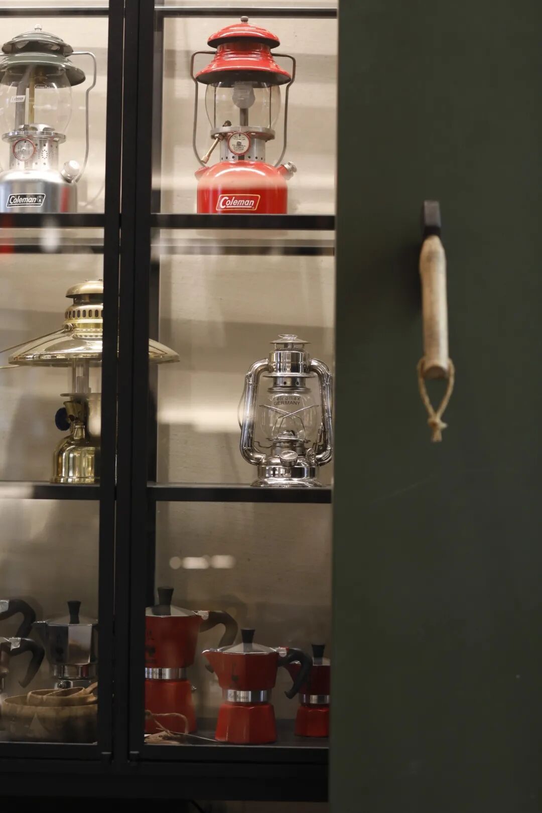 摩卡壶作为王飞最爱的户外露营单品之一,与各式各样的露营灯一起被放到了店内的展示柜中。