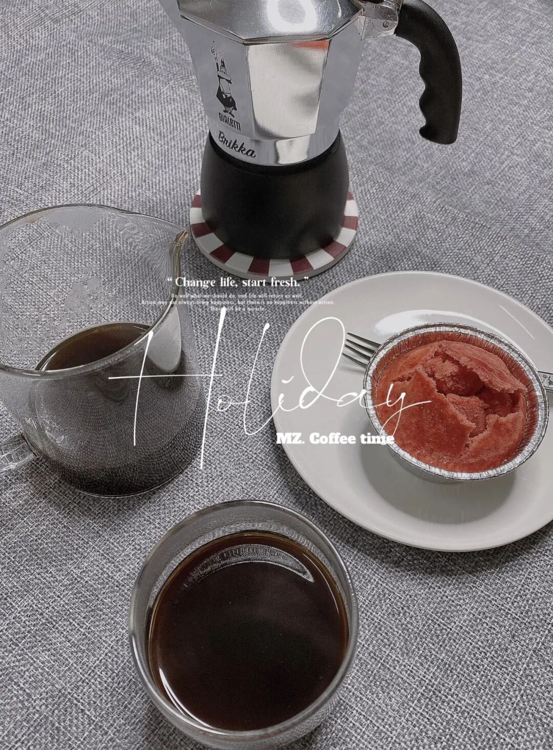“这是我的第二把摩卡壶,很喜欢 刚切了块甜品,搭上拍个照。”