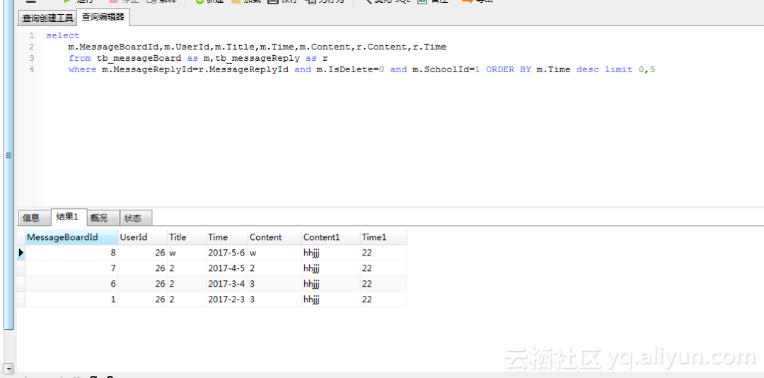 作为新手,在此记下刚踩的一个坑,(踩踩更健康= =踩过痛过才不会再次错),写了一个sql语句用到两张表,两张表中有两个字段名字是一样的都是Time和Content,然后要查询这两张表的这两个字段都要查出来放到一个dto中,dto如下图所示,