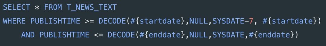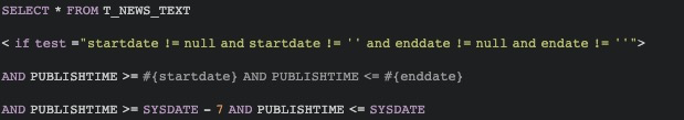 如果需要查询一段时间范围的数据时,可以通过以下动态SQL的方式查询数据: