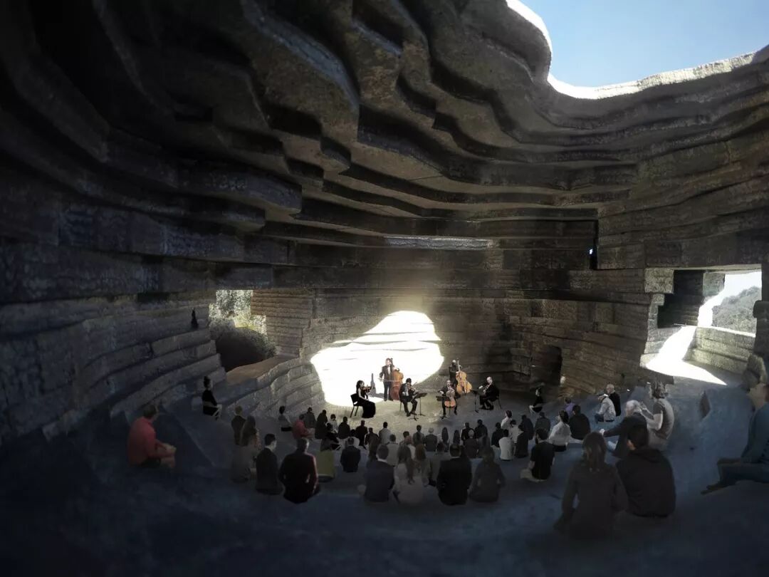 音乐厅位于山谷底部,犹如一块巨石奇迹般地降落在这里。整座建筑由混凝土浇筑,混凝土骨料来自当地富含矿物质的岩石。倒锥形的结构里包含了半露天的剧场、室外舞台、观景平台和一些服务空间。从声学的角度,巨石内部的空腔是一个完美的音乐表演空间,而它如同原始洞穴一般的氛围,也适合独处沉思或社区聚会。顶部的洞口和一些形状不同、大小不一的侧向开洞,将天空、周围山谷的景色,还有大自然的声音一道引入空间中。