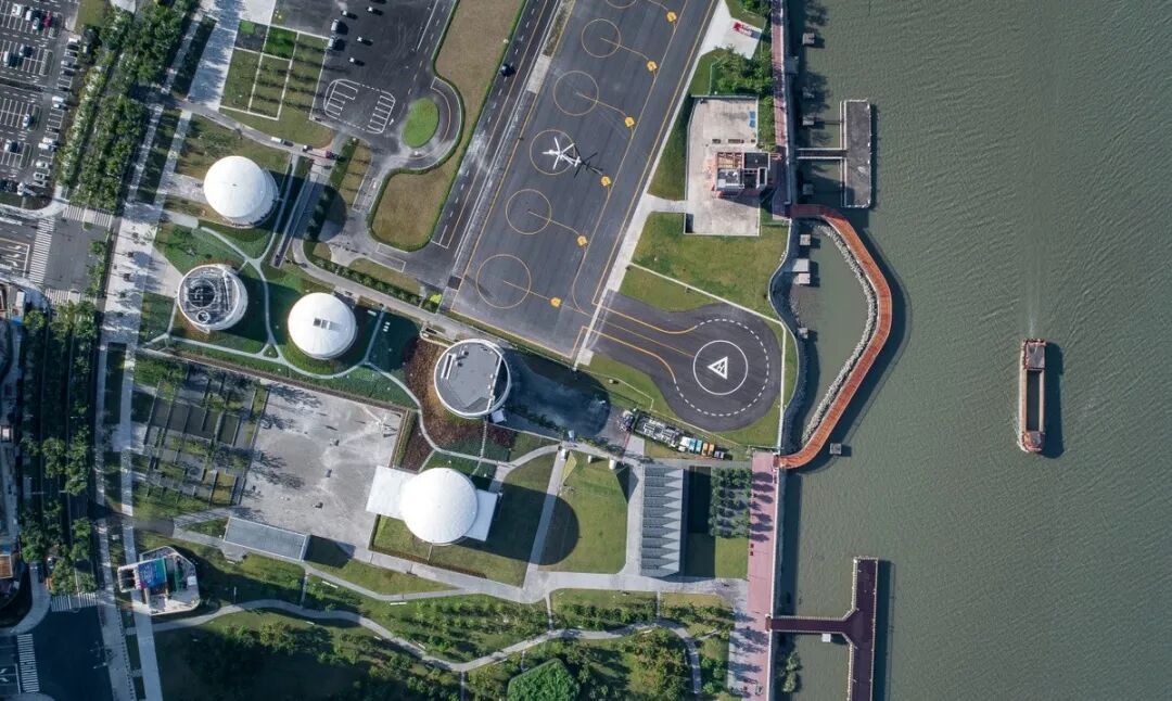 OPEN将五个独立的油罐用一个Z字型的“超级地面(Super-Surface)”联接起来,“超级地面”之上是高低起伏的草坡,之下是灵活连通的室内展览与服务空间。两个开阔的广场和一片都市森林(仅部分完成)将植被、水景、小展厅等自然地联系起来,其间散布公共艺术作品,邀请人们在自然与艺术之间自由穿梭。