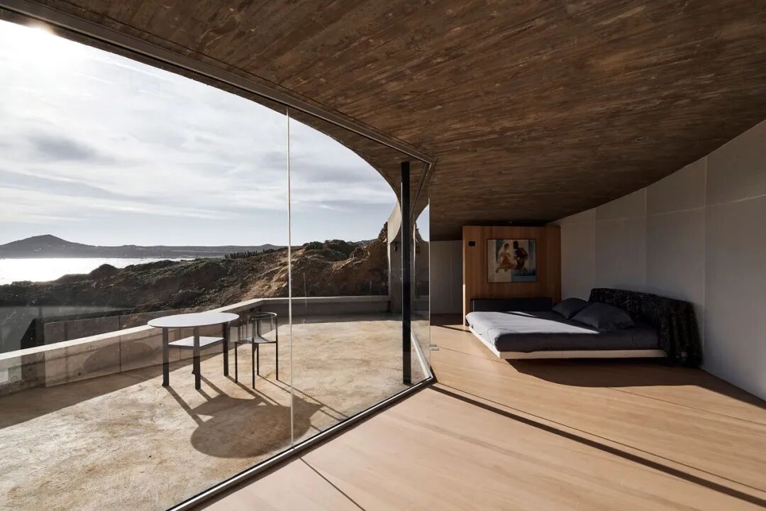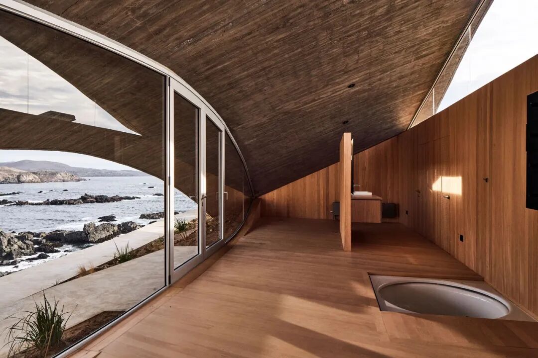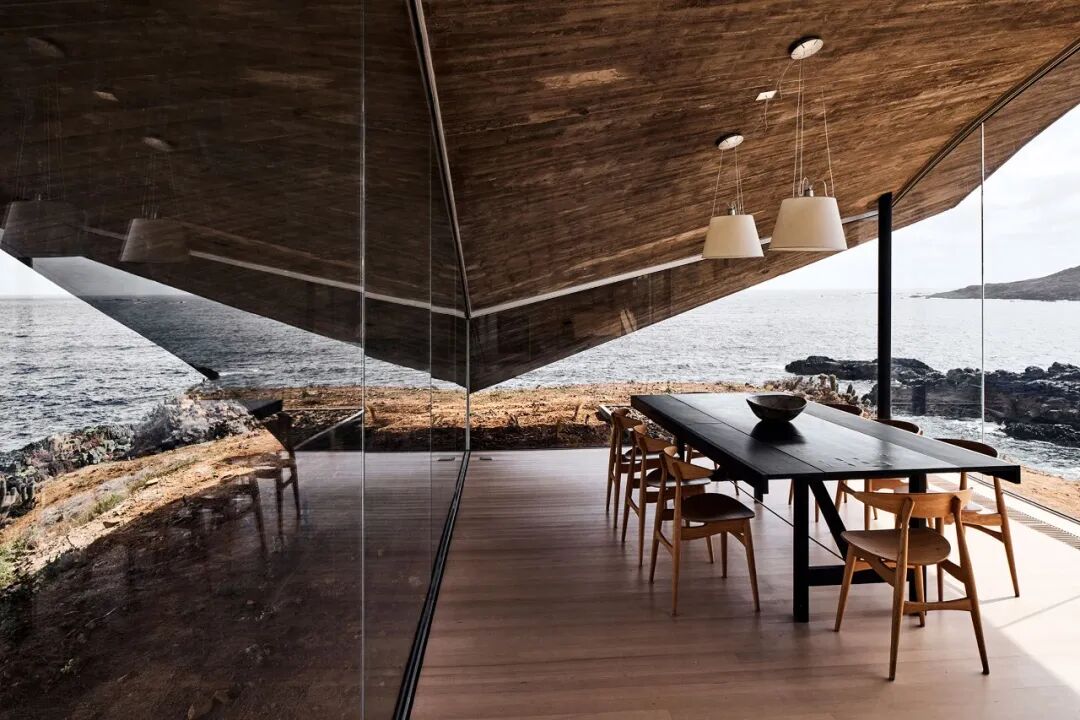 Los Vilos的连体屋顶由玻璃墙和周边的钢柱支撑着。在折角处部分,事务所选择把屋顶处理拱形大玻璃,以看见周围环境。在结构上,斜对角落地的拱创造了更大的跨度,同时开口的方向在过程中转变,把各个方向的景色带给屋内生活的人们。空间自带的多样的外景,是拱顶等经典拱形结构无法实现的。