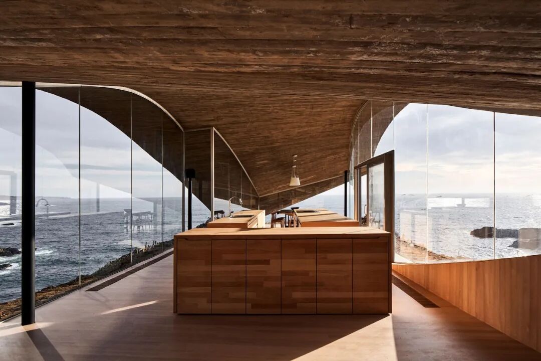 厨房有三个独立的木质岛,但不妨碍看见外景;相邻的餐厅摆放着黑色的桌子和浅色的椅子。上方的天花板上悬挂着白色的吊灯。房子的一大特色是桑拿房,里面有一个下沉式的白色浴缸,可以俯瞰海浪撞击悬崖的情景。