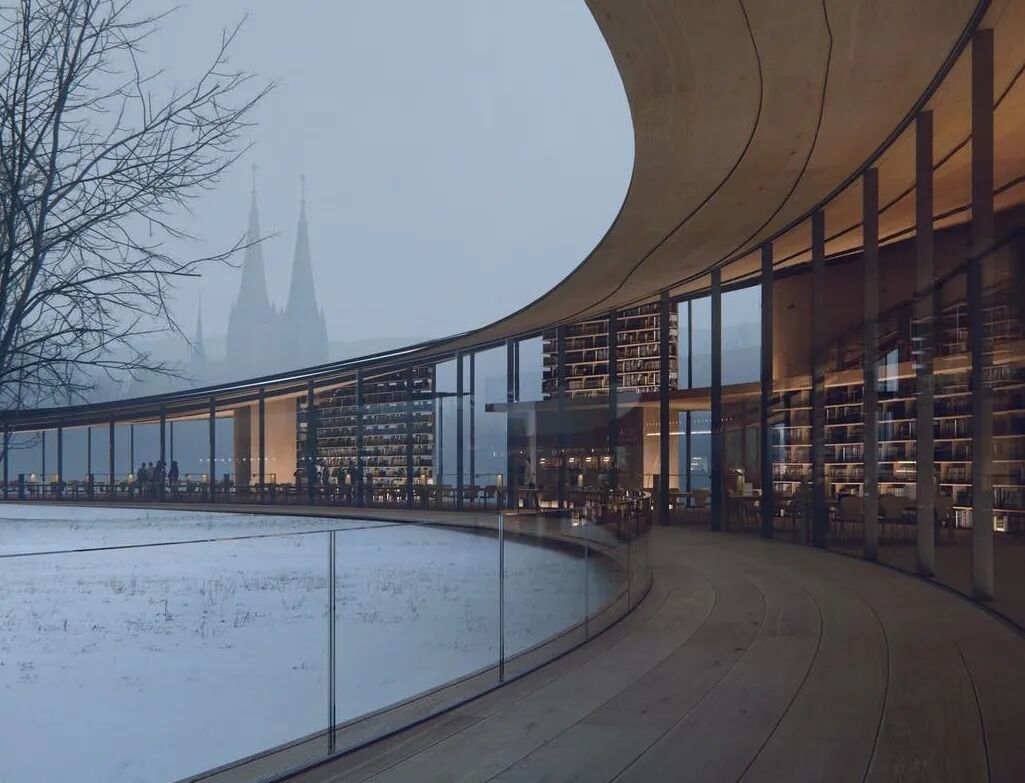 位于公园周边的场地上树木丛生,建筑中的曲线形态以及玻璃立面则依树而建。与此同时,建筑在两个主要楼层中并没有固定的墙体,并以较低的书架作为空间的软隔断,其排布打造了室内与户外的无缝衔接。