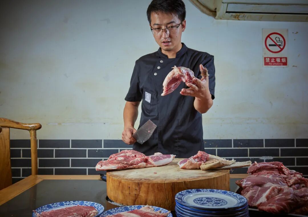 为了选肉,于大爷跟供应商着实费了一番功夫。起初市面上根本买不到按照于家标准分割的羊肉,于大爷找到一家供应商,重新规划了砸羊(分割)的方式,为了能保证货品的供应,于大爷特意让了几分利,最终选定了西蒙的绵羯羊,这种肉质滑嫩的小羊几乎可以满足于大爷的“苛刻”需求。“货送到了,我们还要修掉云皮、纤维瘤、多余的筋块,这些都不能心疼,最后一斤羊肉最多出个六七两。”于大爷说。