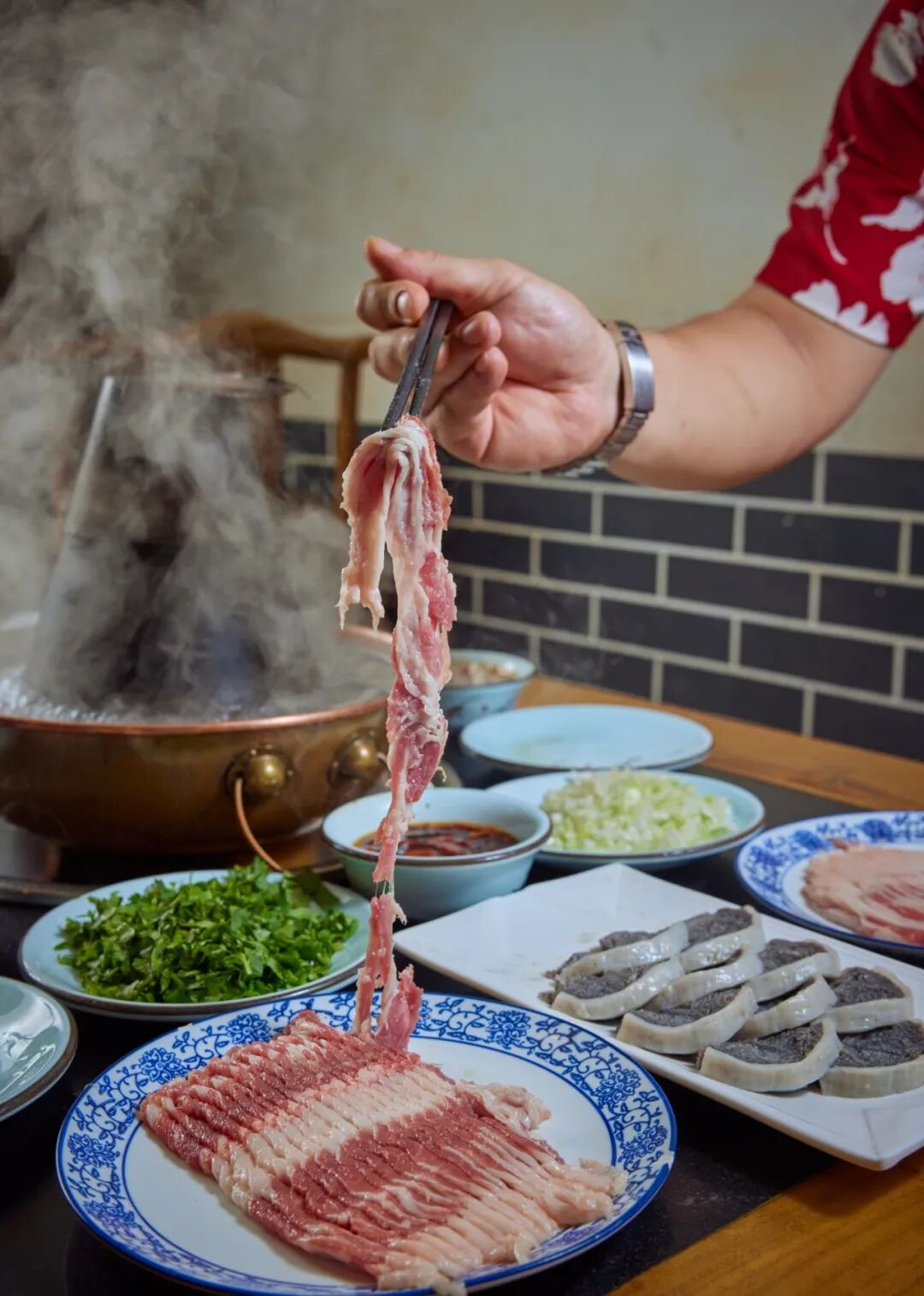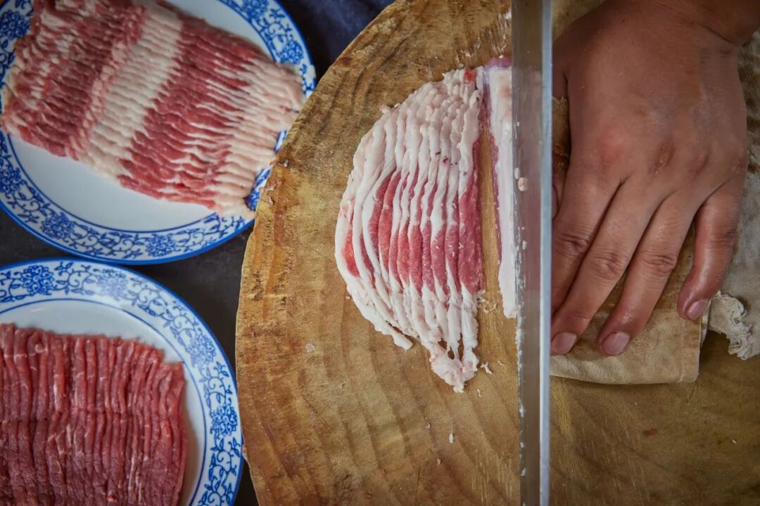 那会儿,于师傅仍然在自己切肉,虽然站在身旁的徒弟也有三五个人,但于师傅还是不放心品质。“当年还有个人跟我打赌,说刀工对涮肉的肉质影响不大,我就跟他一人一把刀,一人一块肉,切头切尾让他随便挑,我俩切完肉用同一壶开水这么一浇,尝完这老哥自己就服了。”于大爷说,“切了快50年的肉,就跟这外科大夫似的,看一眼这肉,长在羊身上的哪个部位,稔熟于心。”说着,于大爷夹起一片羊肉,慢慢展开,如同纸片一样透亮,一样均匀,扔在铜锅里不出几秒,这薄厚不足一毫米的肉就被烫熟了,蘸上浓浓的辣椒油芝麻酱,裹上一点葱花、香菜,吃上一口,肉嫩多汁,口感绵密。他说:“技术是层窗户纸,捅破了就找到规律了。”