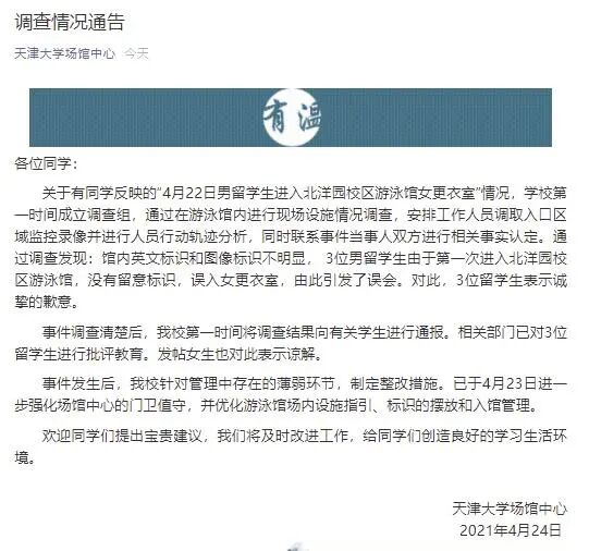 随后天津大学场馆中心微信公号4月24日发布《调查情况通告》称,留学生进入游泳馆女更衣室系“误入”,目前留学生已被批评,女生也对此表示了谅解。