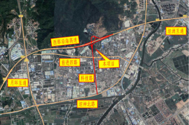 其中新建互通(申堂互通)起点为前进四路与科技路平交口,终点通过互通接入西部沿海高速;互通连接线-科技路改建起点位于坦神北路与科技路平交口,终点位于前进四路与科技路平交口。