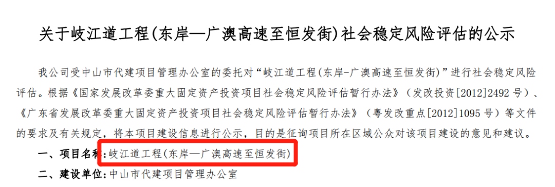 据中山住建局发布的《关于岐江道工程(东岸-广澳高速至恒发街)社会稳定风险评估的公示》可知,先建设岐江道工程(东岸—广澳高速至恒发街)。