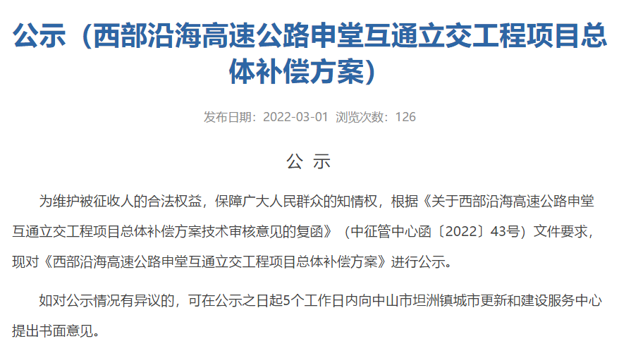 而最新的消息是,今年3月初,中山市坦洲镇人民政府发布的《公示(西部沿海高速公路申堂互通立交工程项目总体补偿方案)》。