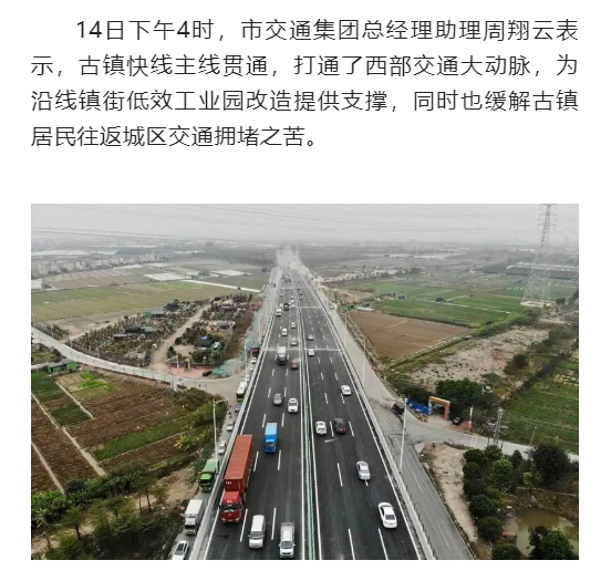 值得一提的是,就在今年1月14日,古镇快线主线建设全部完工,具备通车条件,正式开放交通。