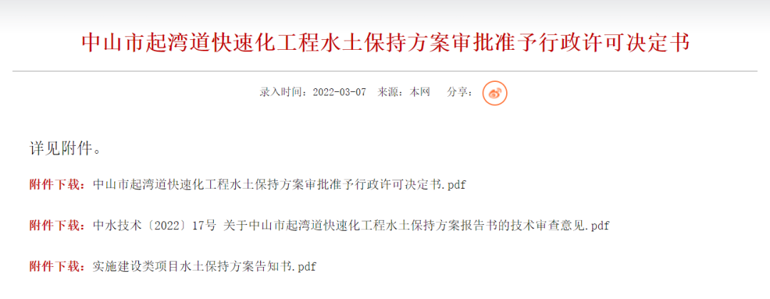 在今年3月7日,中山市水务局政务网上,发布的《中山市起湾道快速化工程水土保持方案审批准予行政许可决定书》,写明了项目动工及竣工时间。(详戳这里)