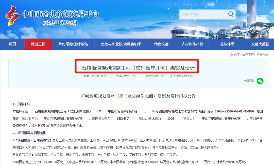 而最新消息是,今年3月17日,中山市公共资源交易中心发布的《石岐街道规划路工程(欢乐海岸北侧)勘察及设计》招标公告。
