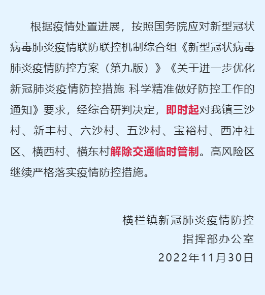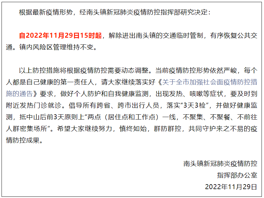 值得一提的是,11月29-30日,中山多个镇区就相继宣布:解除交通管控!