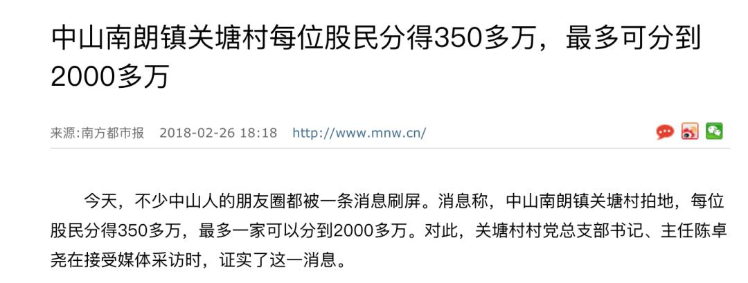 在今年2月下旬,南朗关塘村拍地村民分红12.88亿的消息,即刷爆了中山人朋友圈。