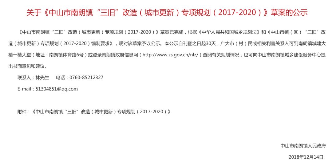 近日,中山市南朗镇人民政府消息,一份《中山市南朗镇“三旧”改造(城市更新)专项规划(2017-2020)》草案公示,共涉及39个片区,约3445.05公顷。