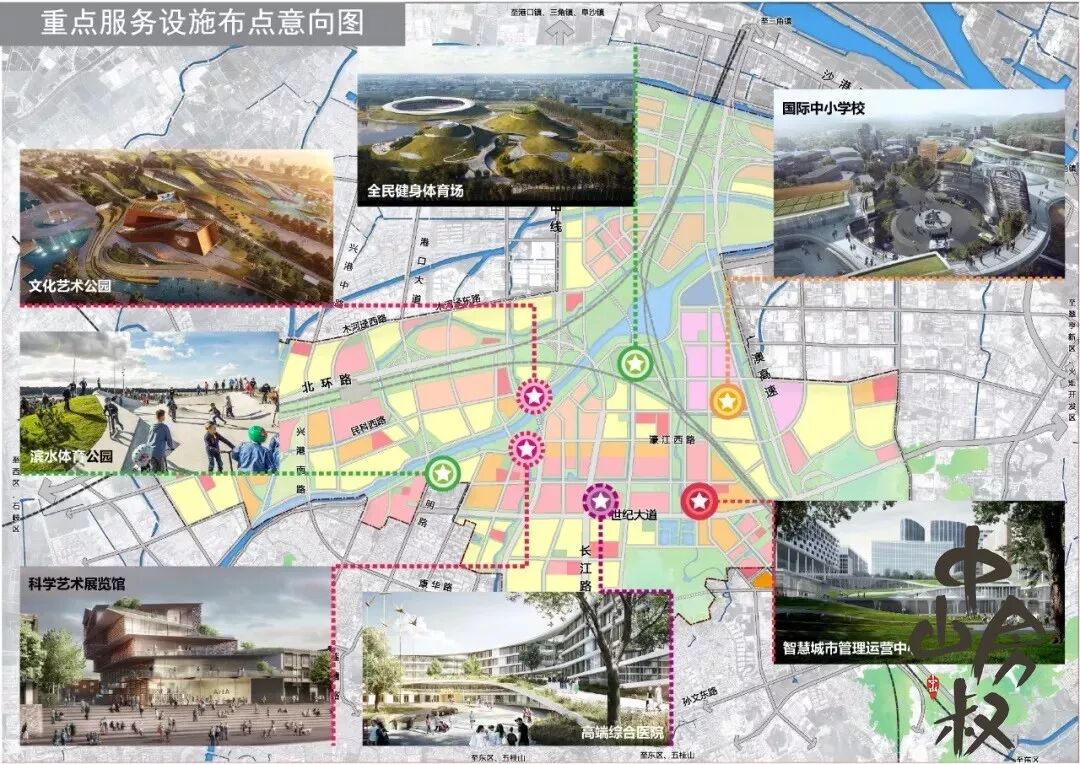 随着大湾区城市建设,各城市之间在着力提升自身竞争力,同时文化和体育已形成产业,公共设施对城市发展形成了拉动效应。岐江新城作为未来城市的新中心,应主动承担起配套区域重要设施的责任,一方面可结合其他大型市级服务设施布局,提高设施布局的集聚性,强化中心区服务功能,另一方面也可提升片区及中山市的区域城市职能。