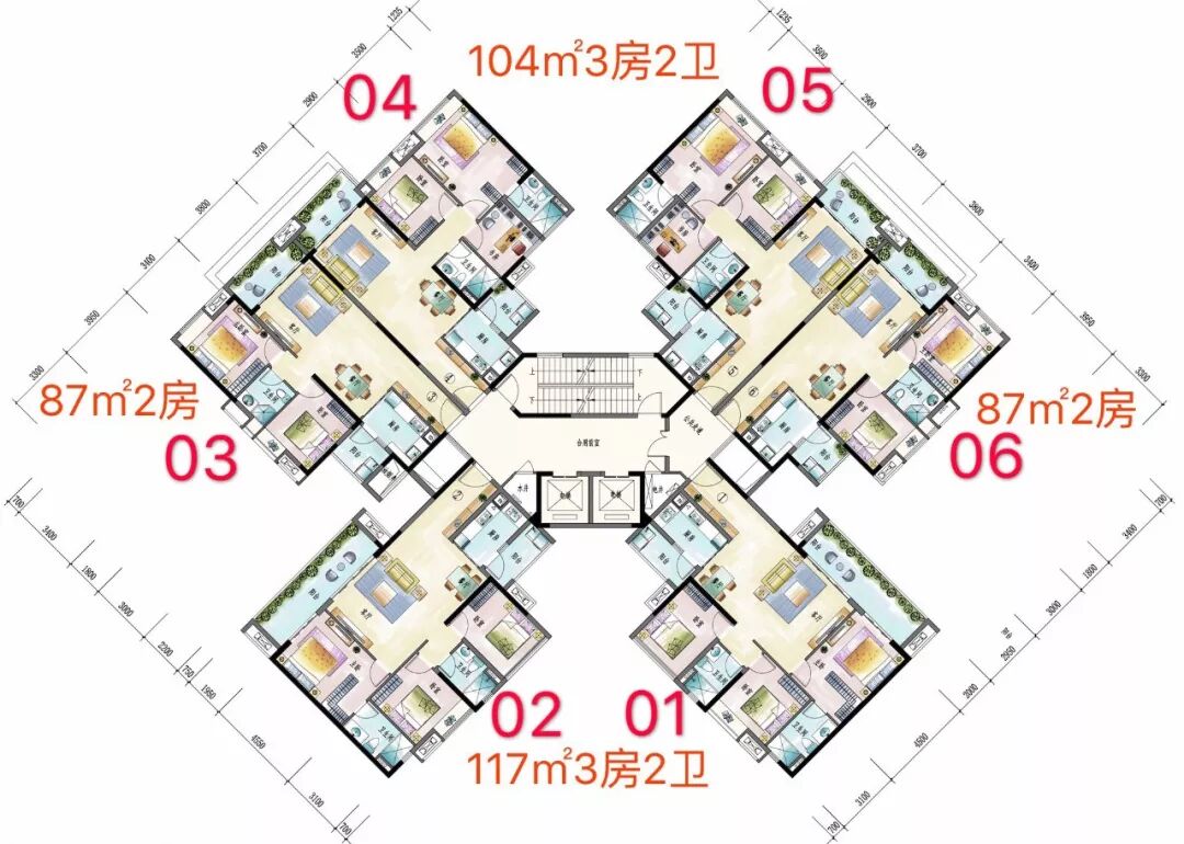 其中87平为两房、104平和107平皆为三房两厅两卫。