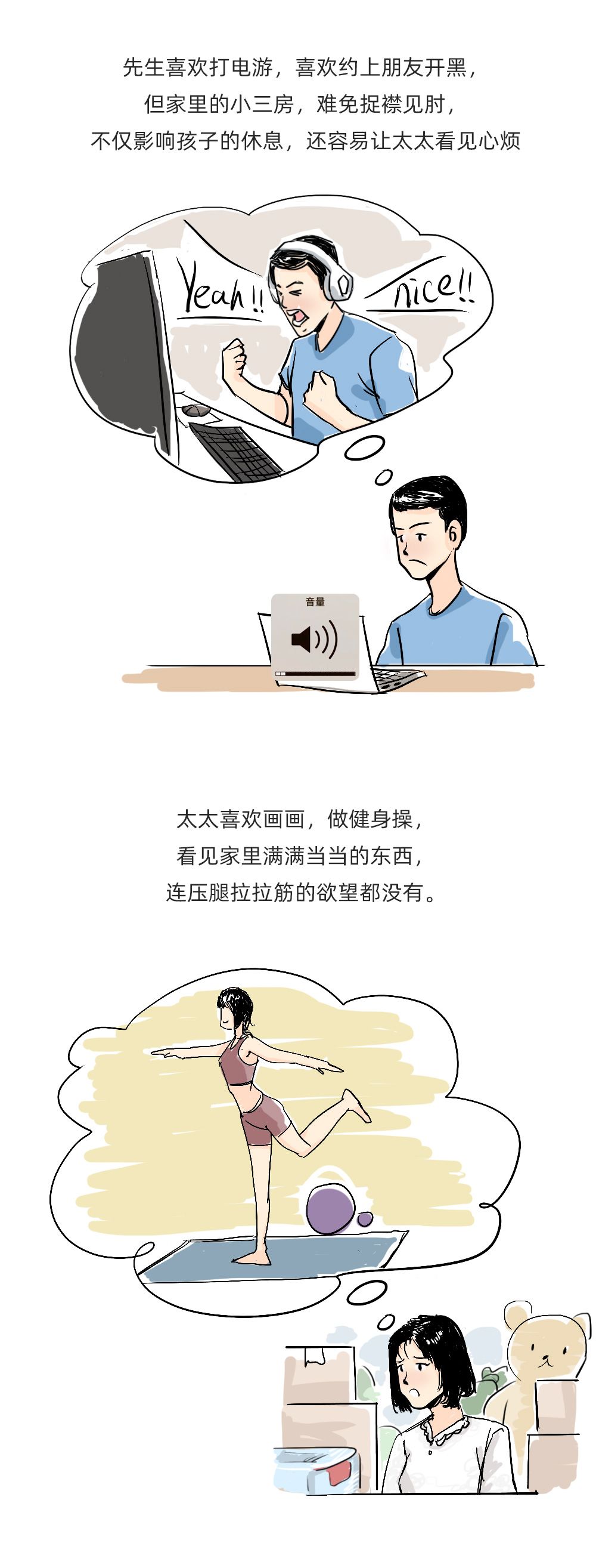 而另一间多功能房,则改造为游戏室和健身房。这一边,先生忙里偷闲,带着耳机玩电游,而另一边,太太听着舒缓的音乐,做瑜伽。