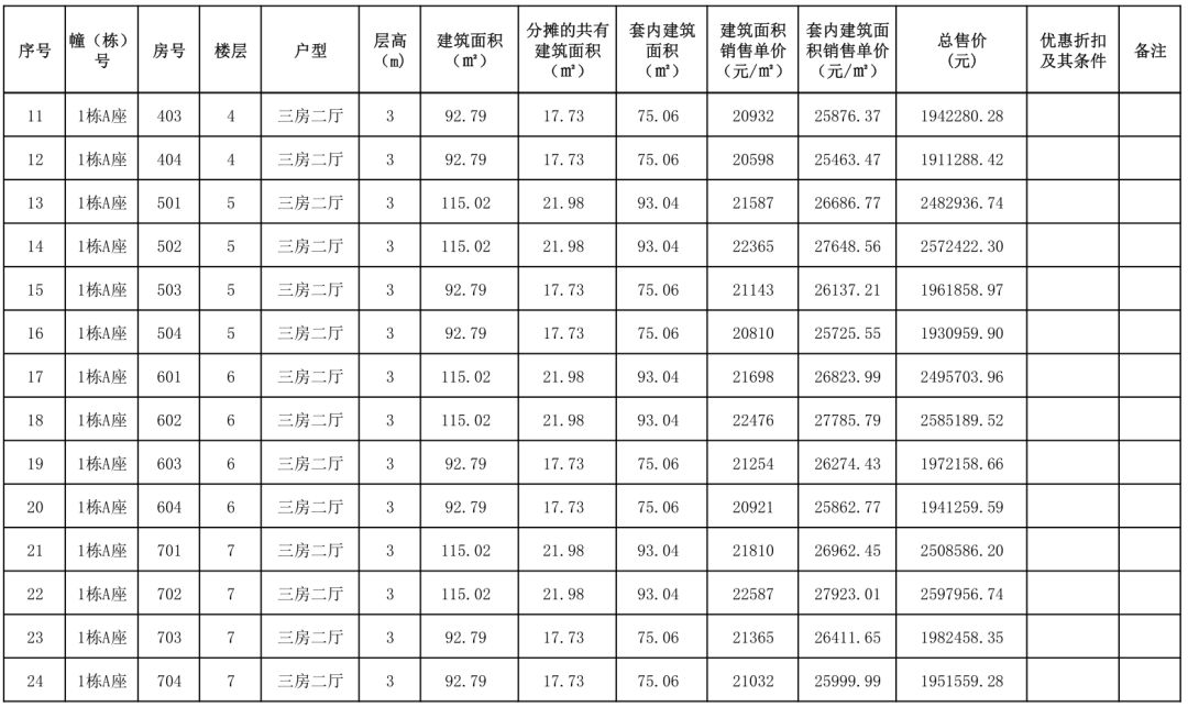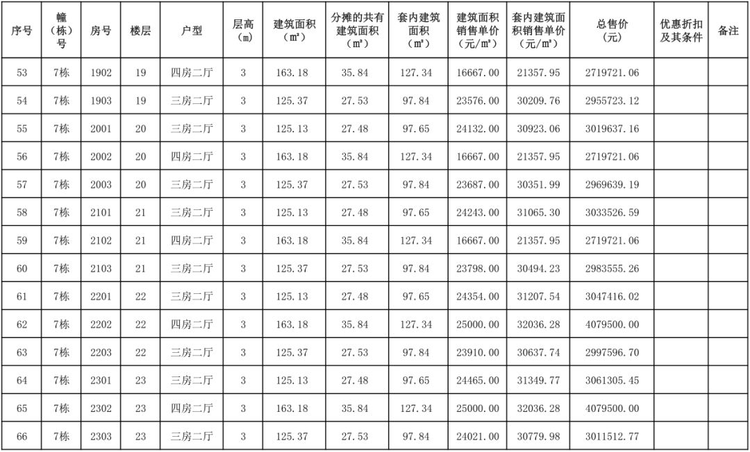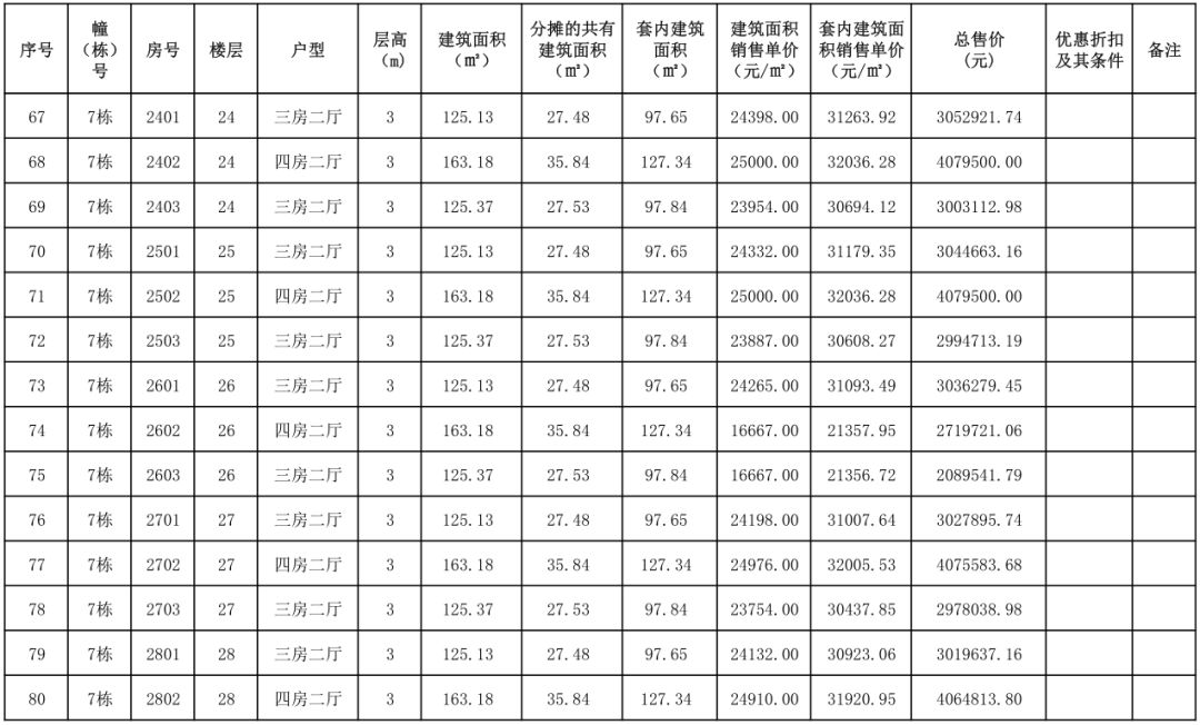 备案价最高为25000元/平,出现在7栋23、24、25层的02单元等,建面约163平。最低价格出现在7栋26层02、03单位,以及2栋23层02、03单位等,建面各不相同,单价均为16667元/平。