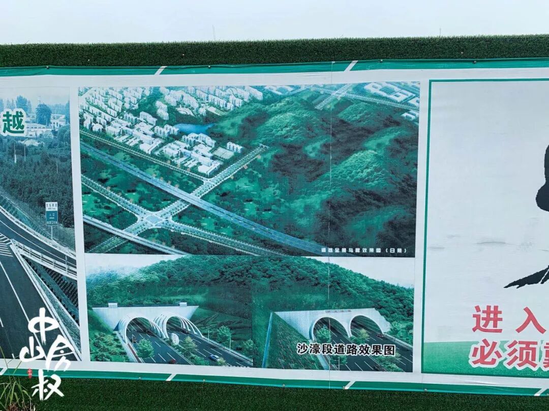 根据现场公示,两孔穿山隧道约555米长,设计双向六车道。