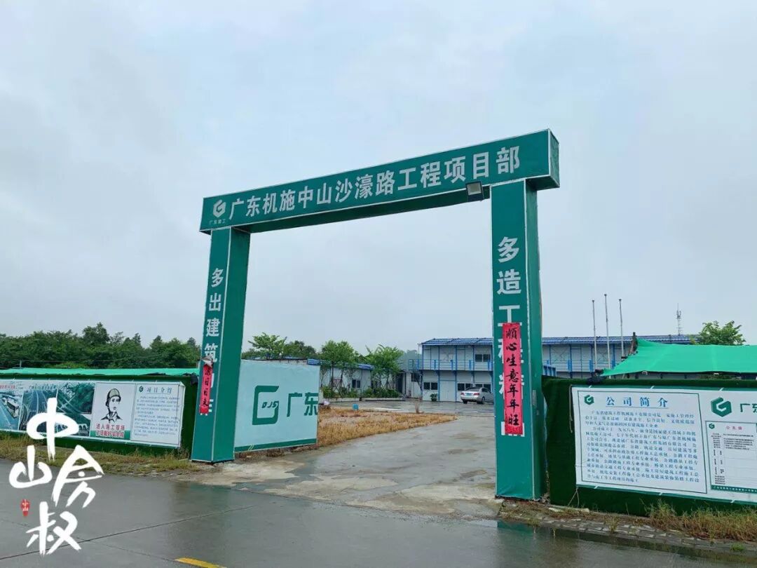 工程概况牌显示,沙濠路为连接城际轻轨中山站的一条主要道路,也是开发区东西走向的一条重要通道,道路全长(2035米,下图红色部分),道路红线宽50米。
