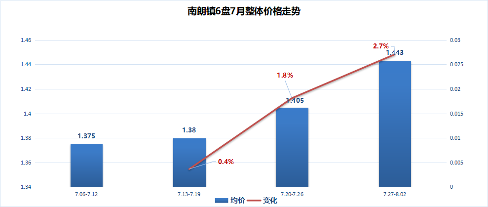 南朗6盘整体均价,从7月第一周的1.375万/平,到7月第四周升至1.443万/平,平均涨价680元/平,升幅4.9%。