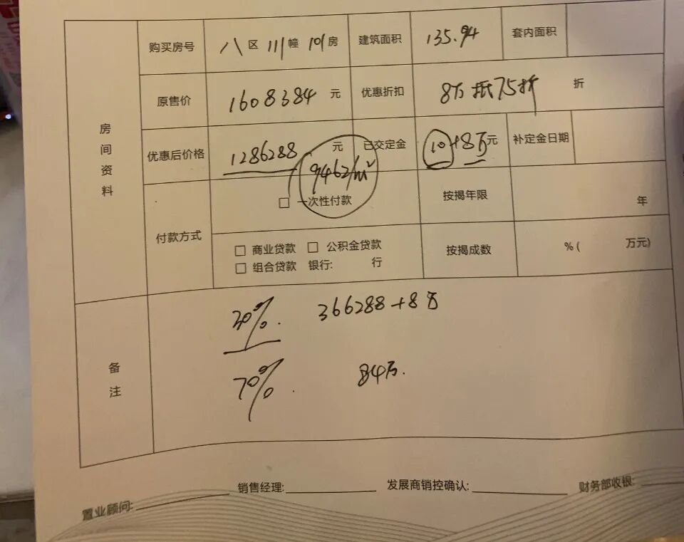 当时,房叔算了一套111栋101单元,建面约136平四房,最终折后总价约128.6万,折后单价9462元/平。