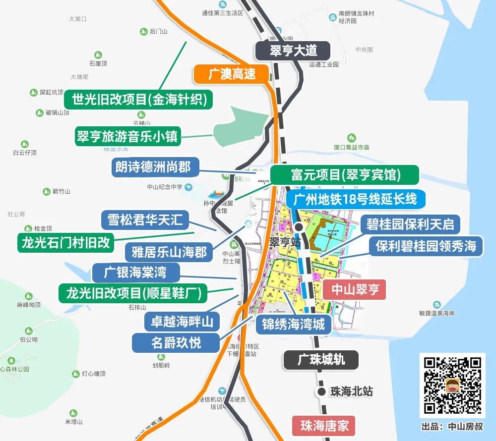 房价方面,目前翠亨站旁在售就有2盘:锦绣海湾城、保利碧桂园领秀海。但周边一路之隔,多盘在售。此前待售的广银海棠湾和朗诗德州尚郡也已入市,一手价格在1.17-1.7万/平的区间。此外,板块的还有雅居乐山海郡、碧桂园保利天启、锦绣海湾城的二手房,货量也十分庞大。南朗虽然靠近珠海,但多年来道路尚未打通,两地居民仍靠一条小路通勤,优势并未完全发挥。所幸的是,今年动作频频,先是翠亨站重启、再是海湾一路断头路动工,南朗主动对接中山主城区、翠亨新区起步区和珠海高新区。一站/一路到珠海的情况下,带给了翠亨新区巨大的想象力,届时能否凭借交通优势再次腾飞,我们拭目以待。当下的深中两侧,因为超级工程深中通道,已是风口,更是趋势。风口之下,这里有能让深圳人和湾区人席地而坐的剖析内容。珠江口,这一个未来之地,你当应该提前谋划,扫描下方二维码关注吧。