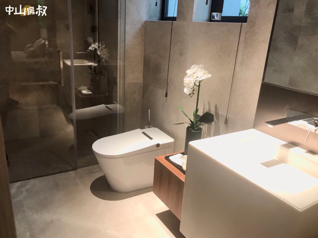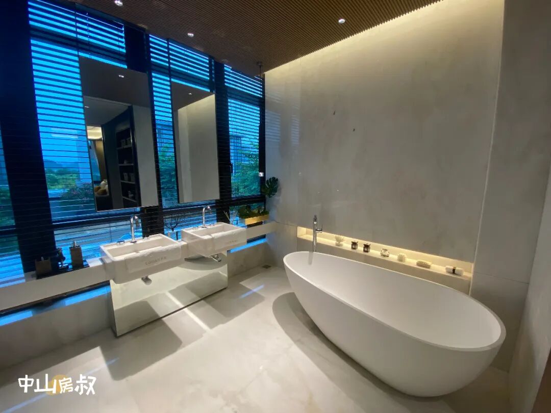 卫生间为双洗漱台+马桶座+淋浴室设计,搭配温泉式浴缸,连洗澡都变得那么有仪式感。