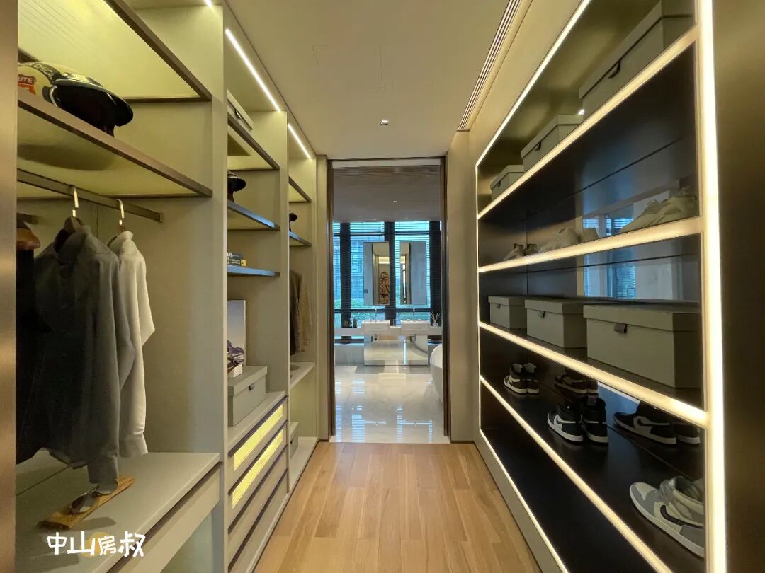 这是为儿子准备的房间呀!超长的步入式衣帽间,零散的摆放着几双“AJ”和男孩子的收藏品,直通约4.5米开间的卫生间。