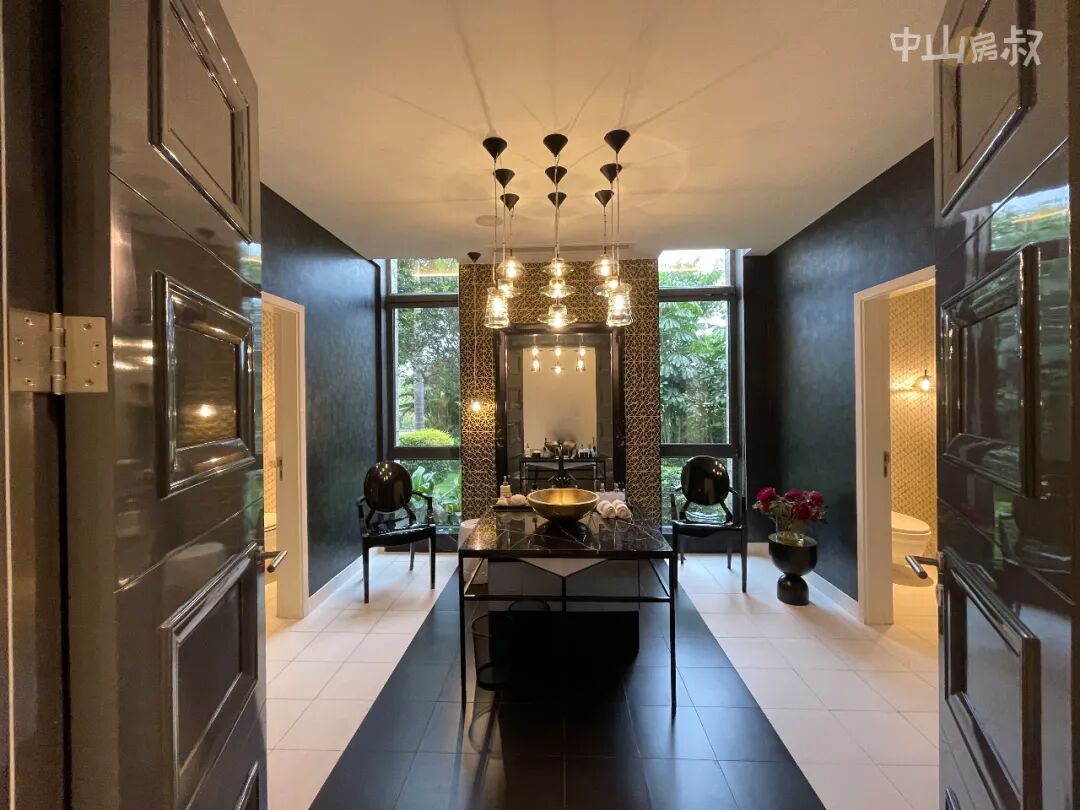 中西餐厅两种风格冲击视觉。西餐厅是极简的西式风格;中餐厅,是极致奢华风,以黑色、红色和金色为主调,配上奢华的落地灯,像极了大佬们的VIP房。![]()
