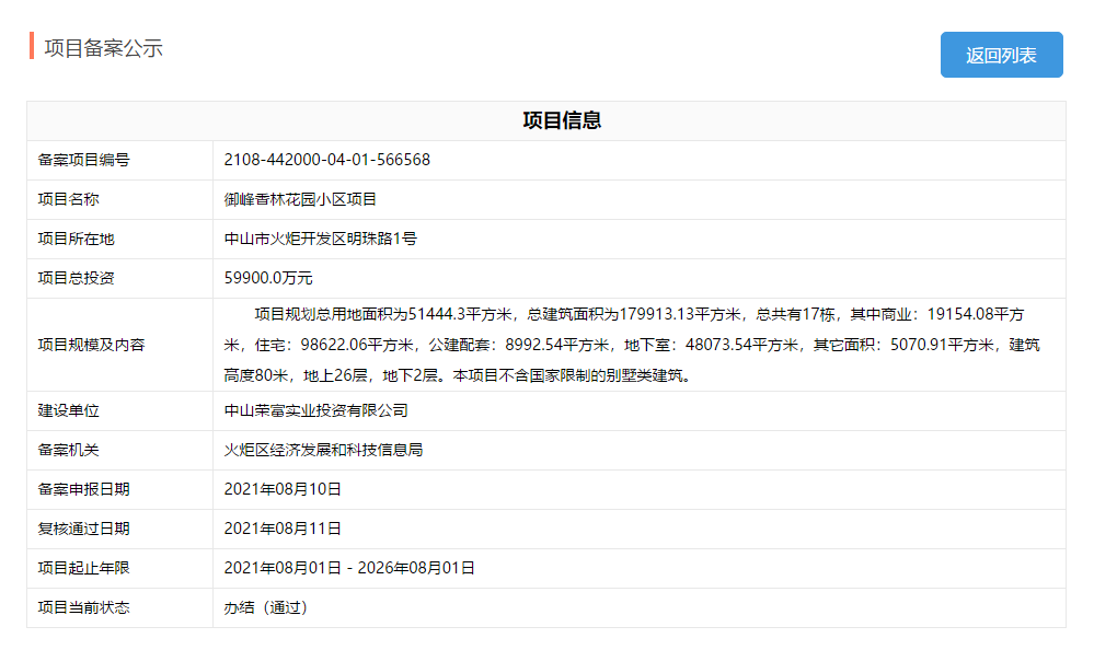 今天(8月11日),御峰香林花园小区项目正式备案!