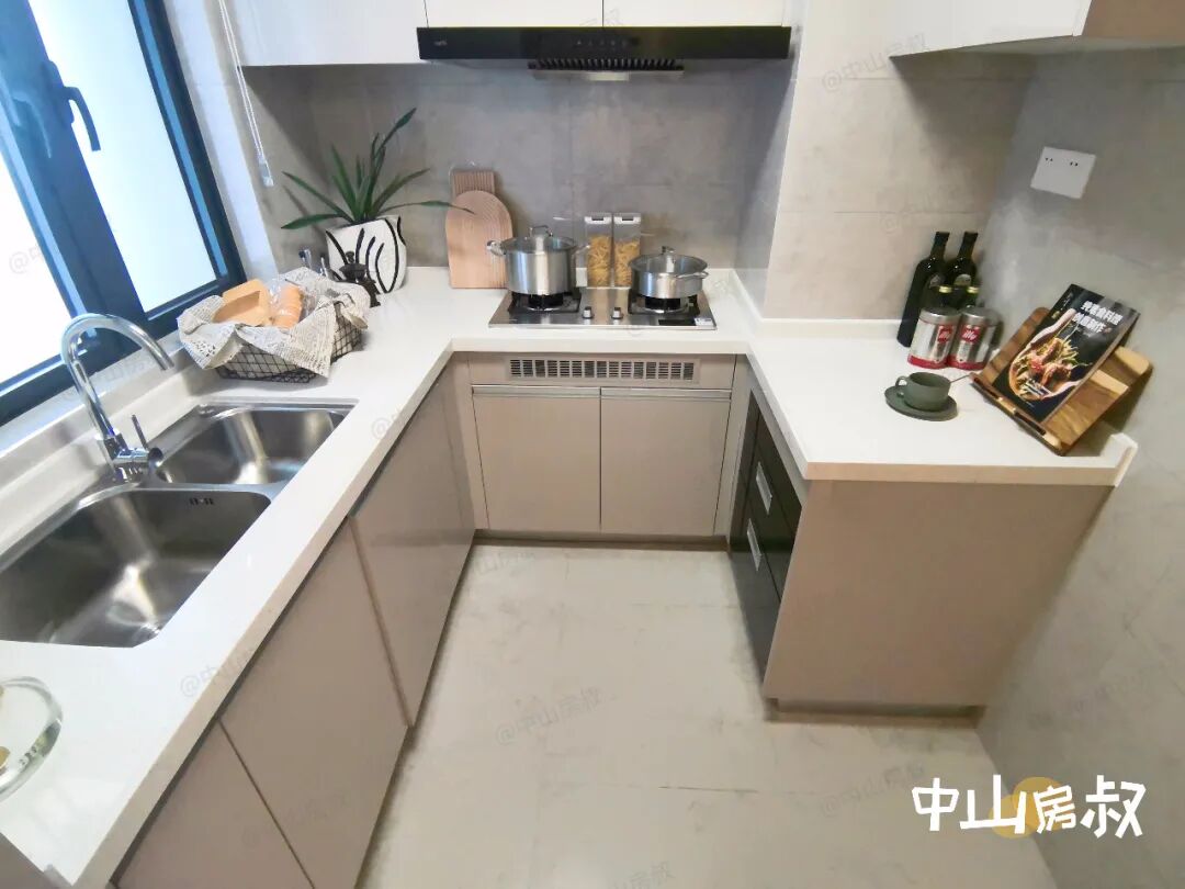 厨房为U型设计,预留有冰箱位,但操作台面稍显紧凑。