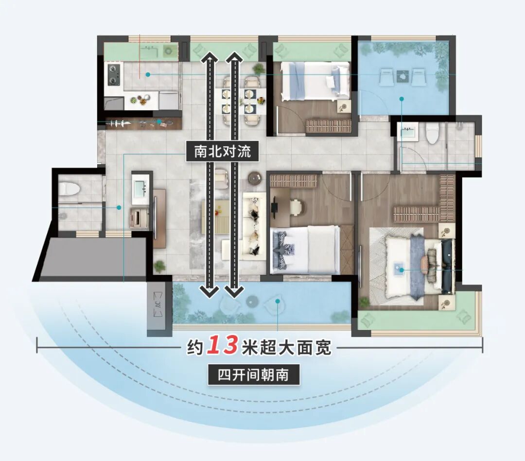 像一套约96平极致4房户型,使用率高达97%,年轻置业者们完全能轻松拿下,实现一步到位的终极理想。