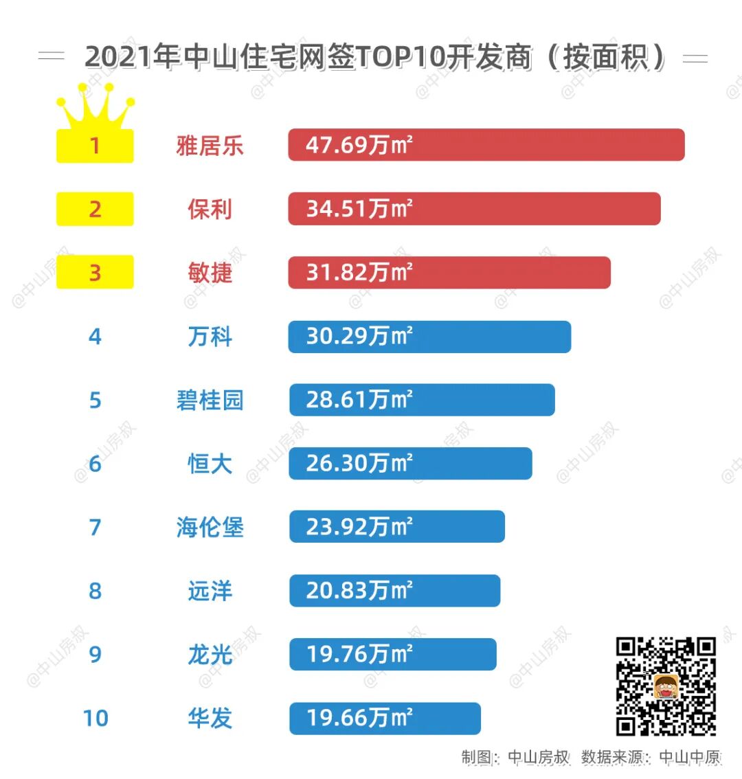 按照成交面积来算,2021年中山住宅网签TOP3的开发商为雅居乐、保利、敏捷。