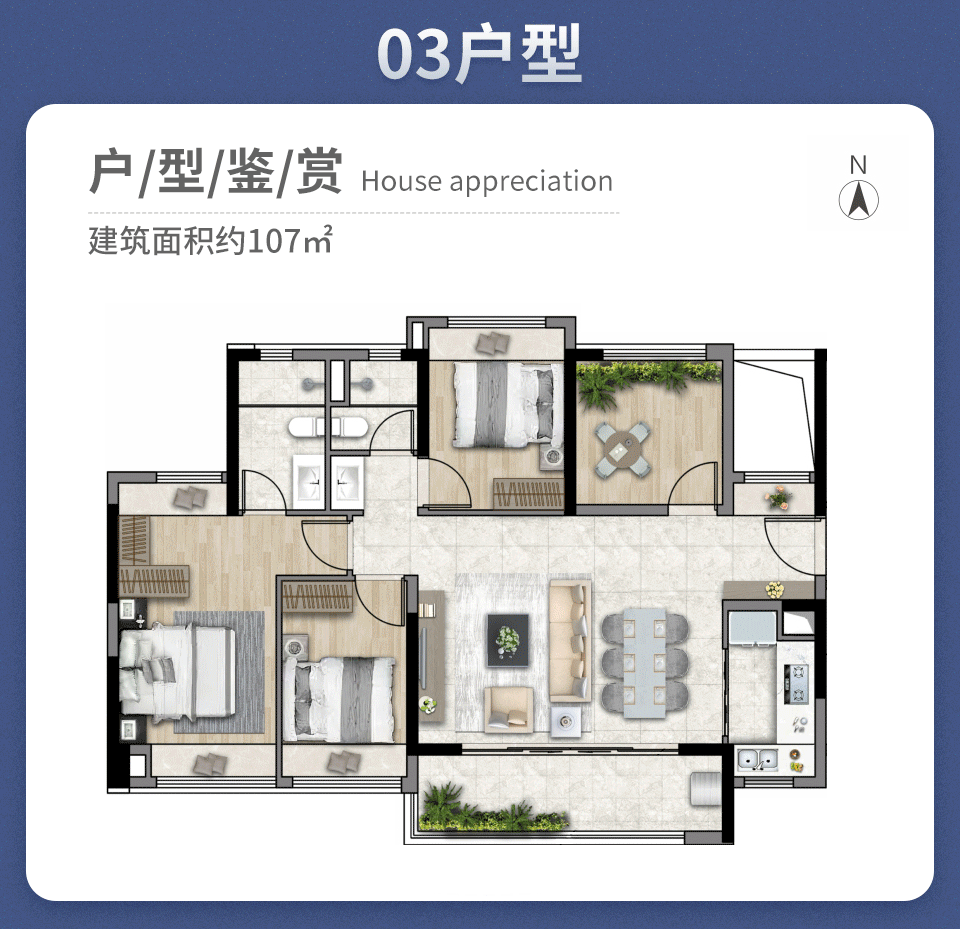 除了上述的复式外,C盘还有一款107㎡四房,也是亮点多多。![]()