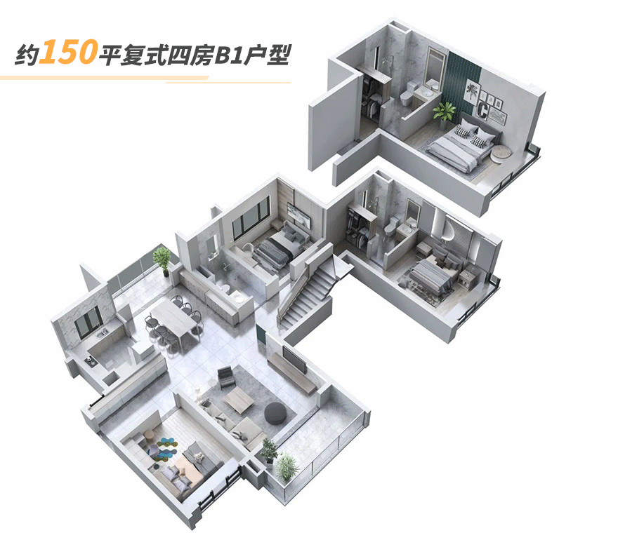 中心组团约140㎡4房2厅2卫,私梯入户,南北双阳台设计。![]()