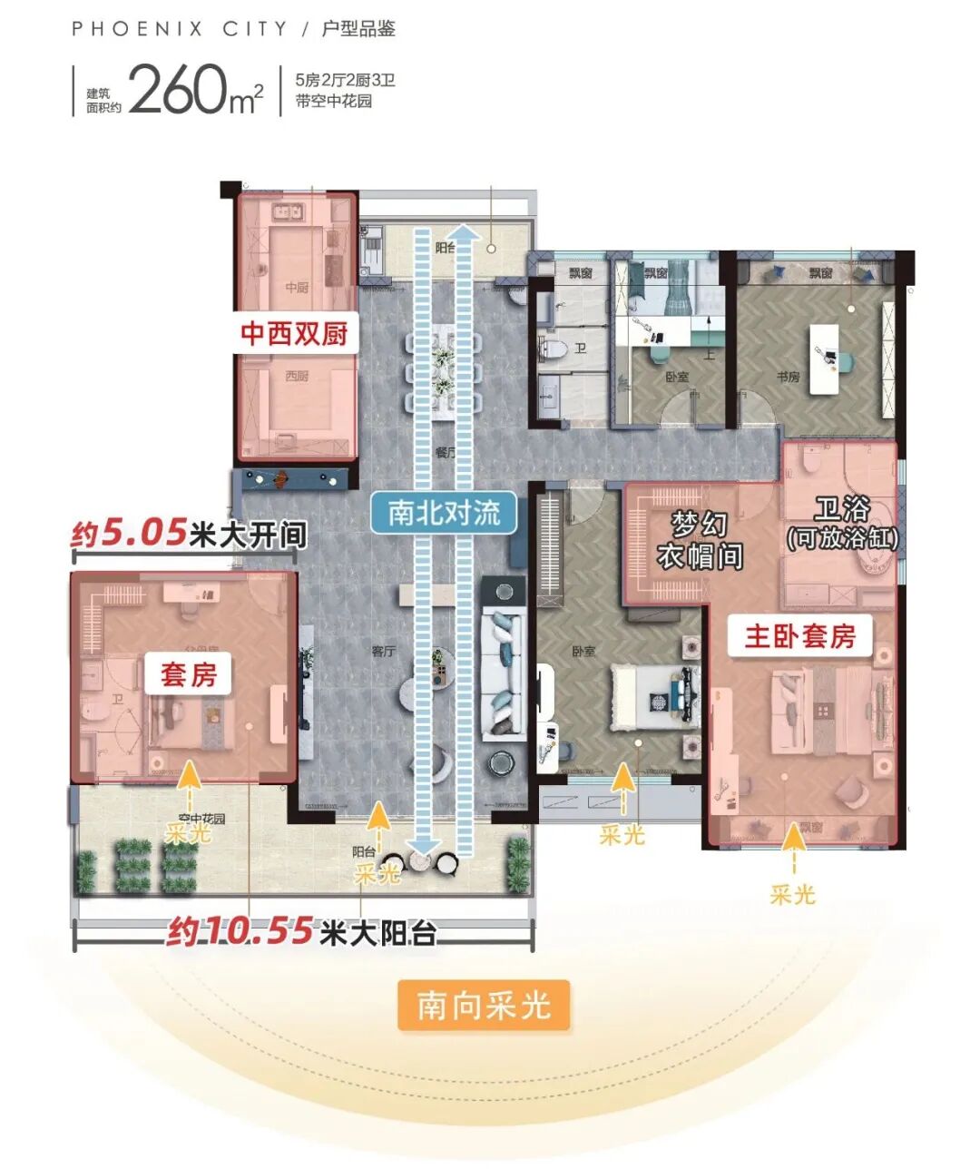 入户旁的房间,就是约5.05米超大开间的套房,并且还能直通南向空中花园。“顶配款”的主卧,媲美一套五星级酒店的套房,有着超大的衣帽间和卫浴。南北双阳台的竖厅设计,透过落地窗看约10.55米采光面的大阳台,揽下山湖大境、还有对面的别墅群。中西双厨,都是大U型布局,就算5口人一起做饭也绰绰有余。